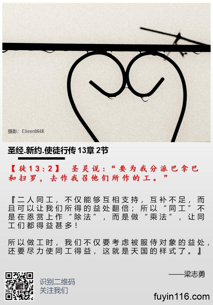 我们在圣经中不断看到“同工”的原则,不仅有这里圣灵差遣巴拿巴和保罗,还有主耶稣差遣门徒,总是“两个两个地出去”,智者所罗门说“两个人总比一个人好,因为二人劳碌同得美好的果效。”(传4:9)