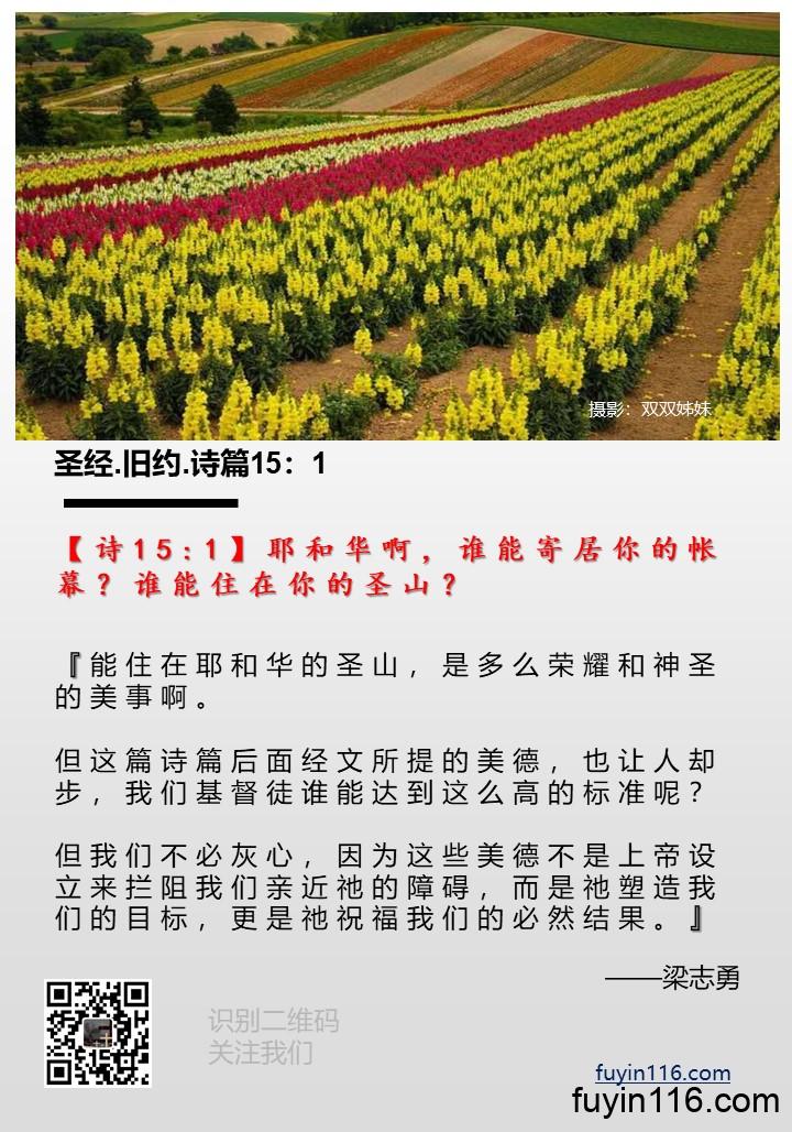 感谢你把诗篇15篇赐给我们,这是一首极美的诗篇,能滋润我们的心,能提升我们的境界,能激发我们的盼望。