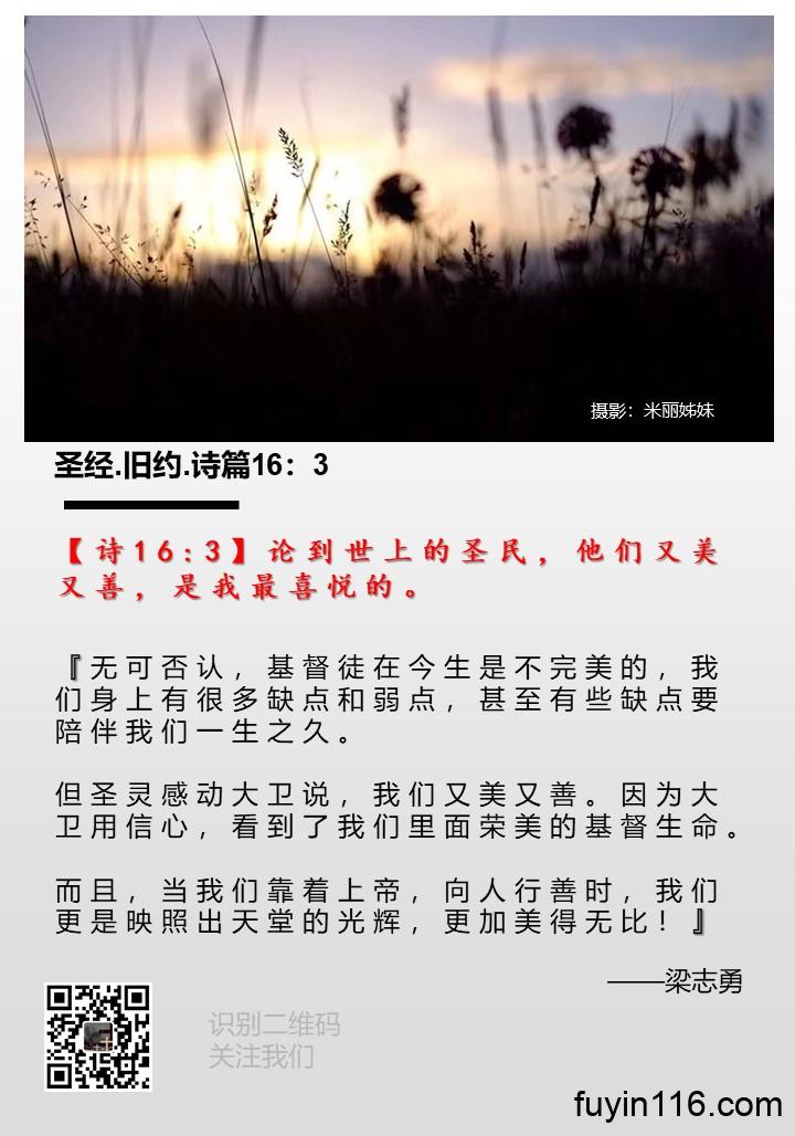 【诗16:3】论到世上的圣民,他们又美又善,是我最喜悦的。