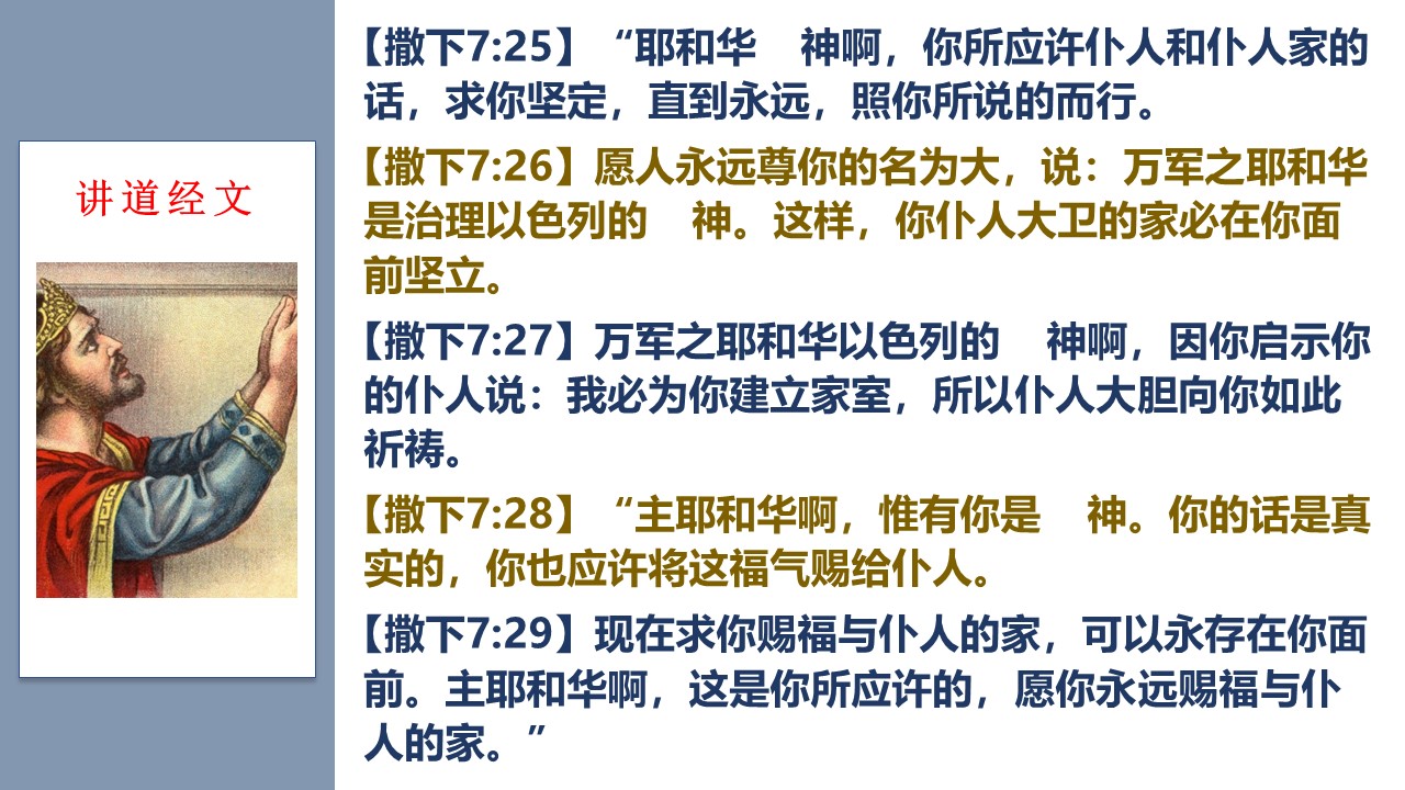 最伟大的君王大卫,听到上帝要坚立他的家室,就深深感动,向上帝做了一个伟大的感恩祷告。