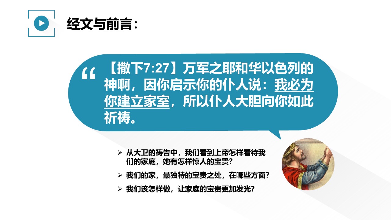 从圣灵感动大卫的祷告中,我们看到上帝怎样看待我们的家庭,她有怎样惊人的宝贵?