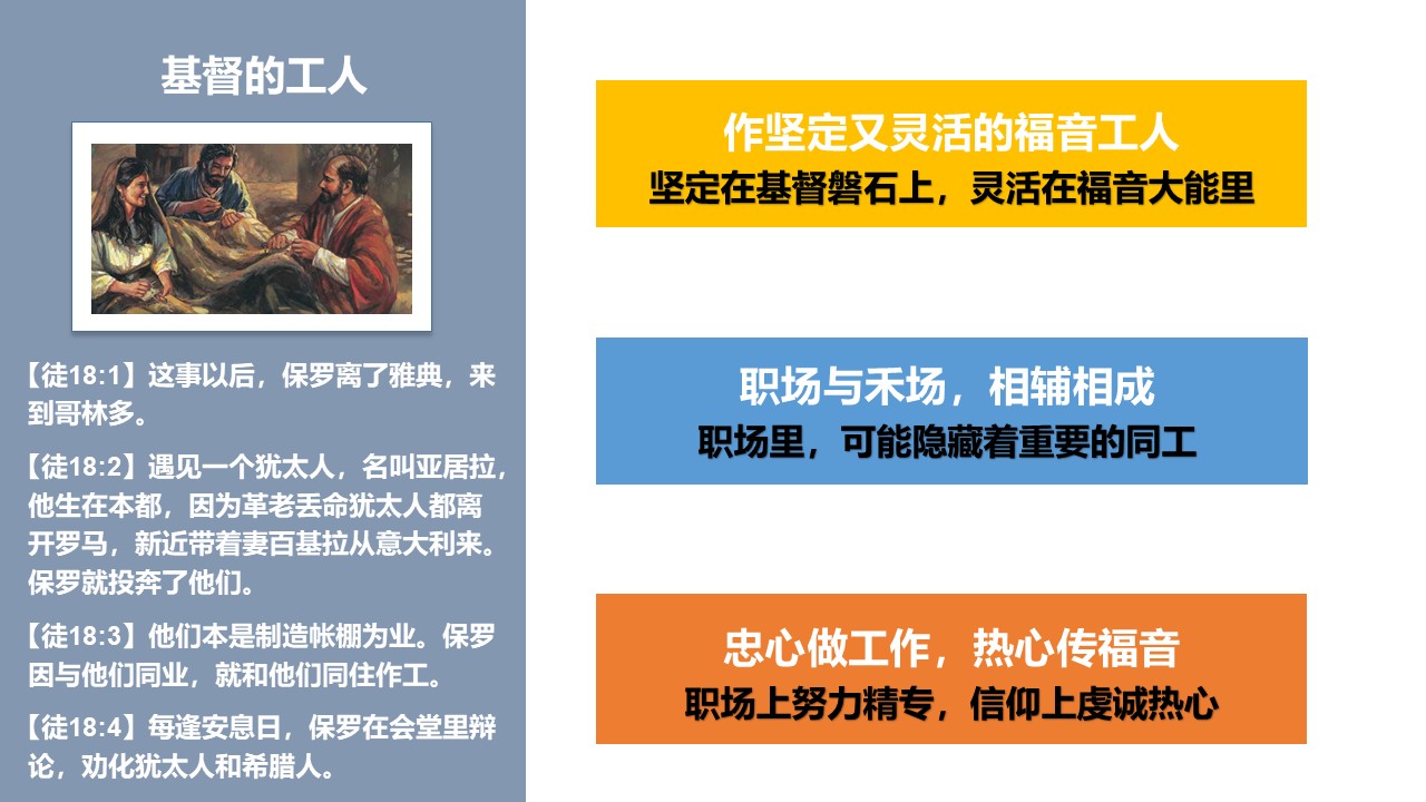 宣教使者保罗,很自然地与亚居拉、百基拉夫妇一起织帐篷,圣经记载这个故事,必有深意。