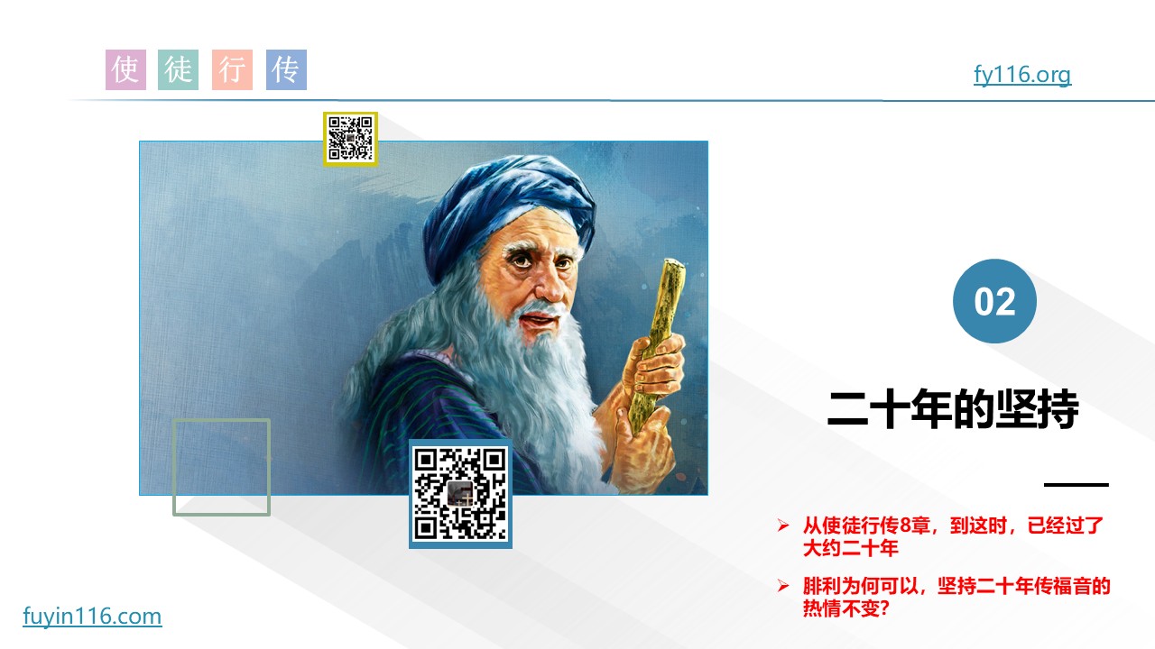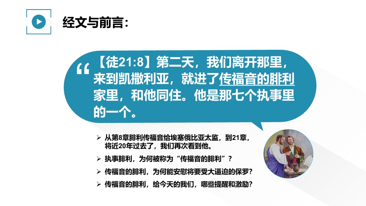 从第8章腓利传福音给埃塞俄比亚太监,到21章,将近20年过去了,我们再次看到他。