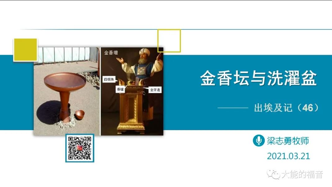 今天分享的是《出埃及记》30章有关“金香坛”和“洗濯盆”的内容。