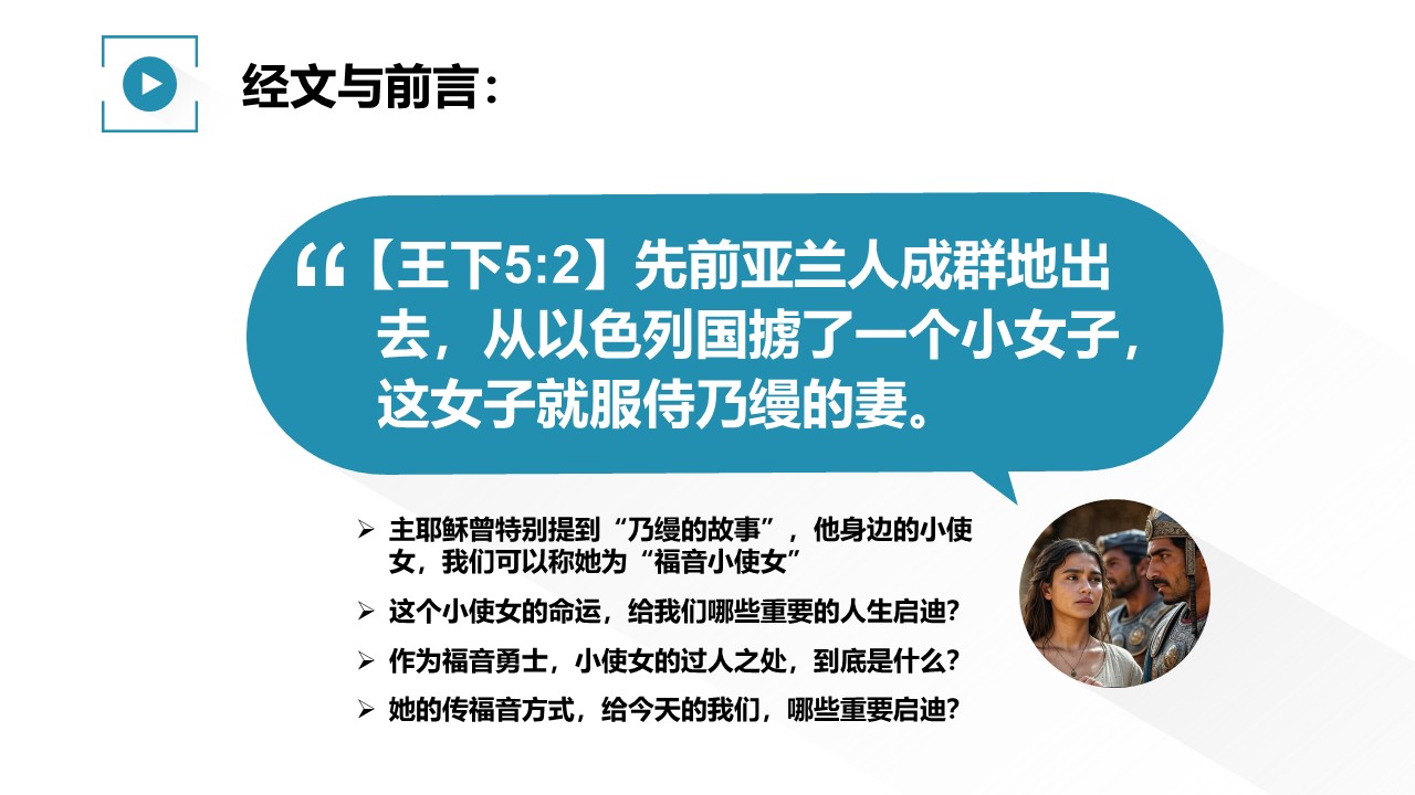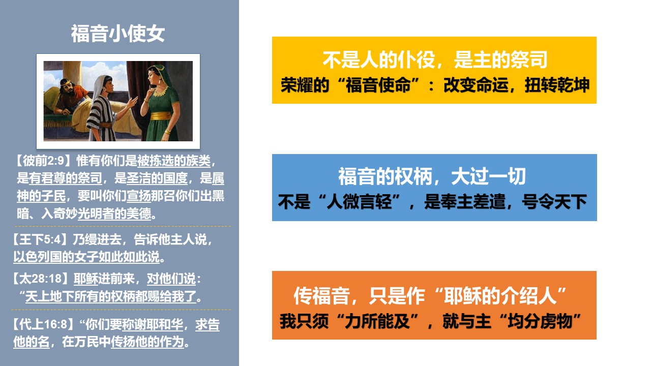 主耶稣在讲解福音时,曾特别提到“乃缦的故事”;乃缦身边的小使女,我们把她称为“福音小使女”。