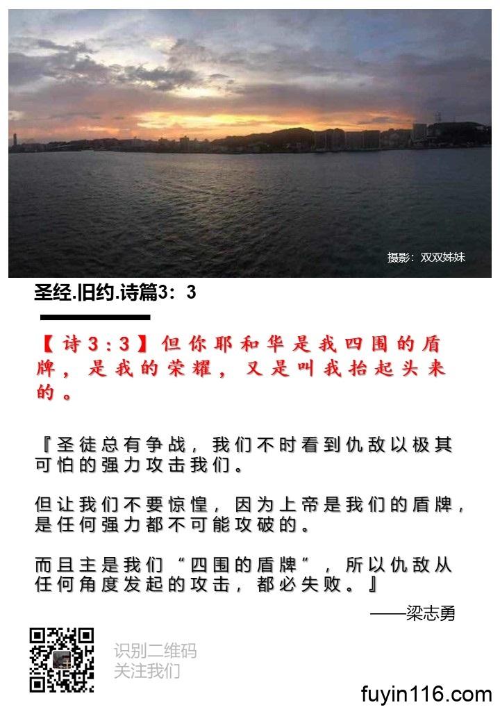 【诗3:3】但你耶和华是我四围的盾牌,是我的荣耀,又是叫我抬起头来的。 《四围的盾牌,是什么意思?》 作者:梁志勇牧师 朗读:徐辉姊妹 【诗3:3】但你耶和华是我四围的盾牌,是我的荣耀,又是叫我抬起头来的。 『圣徒总有争战,我们不时看到仇敌以极其可怕的强力攻击我们。 但让我们不要惊惶,因为上帝是我们的盾牌,是任何强力都不可能攻破的。 而且主是我们“四围的盾牌”,所以仇敌从任何角度发起的攻击,都必失败。』 亲爱的天父,我们感谢和赞美你, 你是我四围的盾牌,你是保护我的主。我要称颂你,我要赞美你。 你的保…
